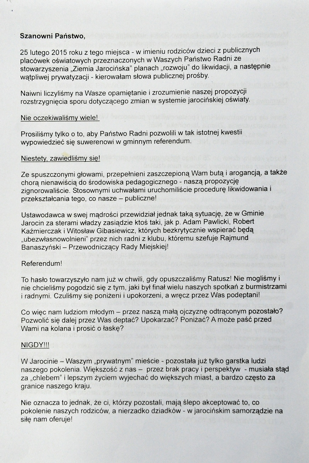 Jarocin. Apel Komitetu Referendalnego do radnych