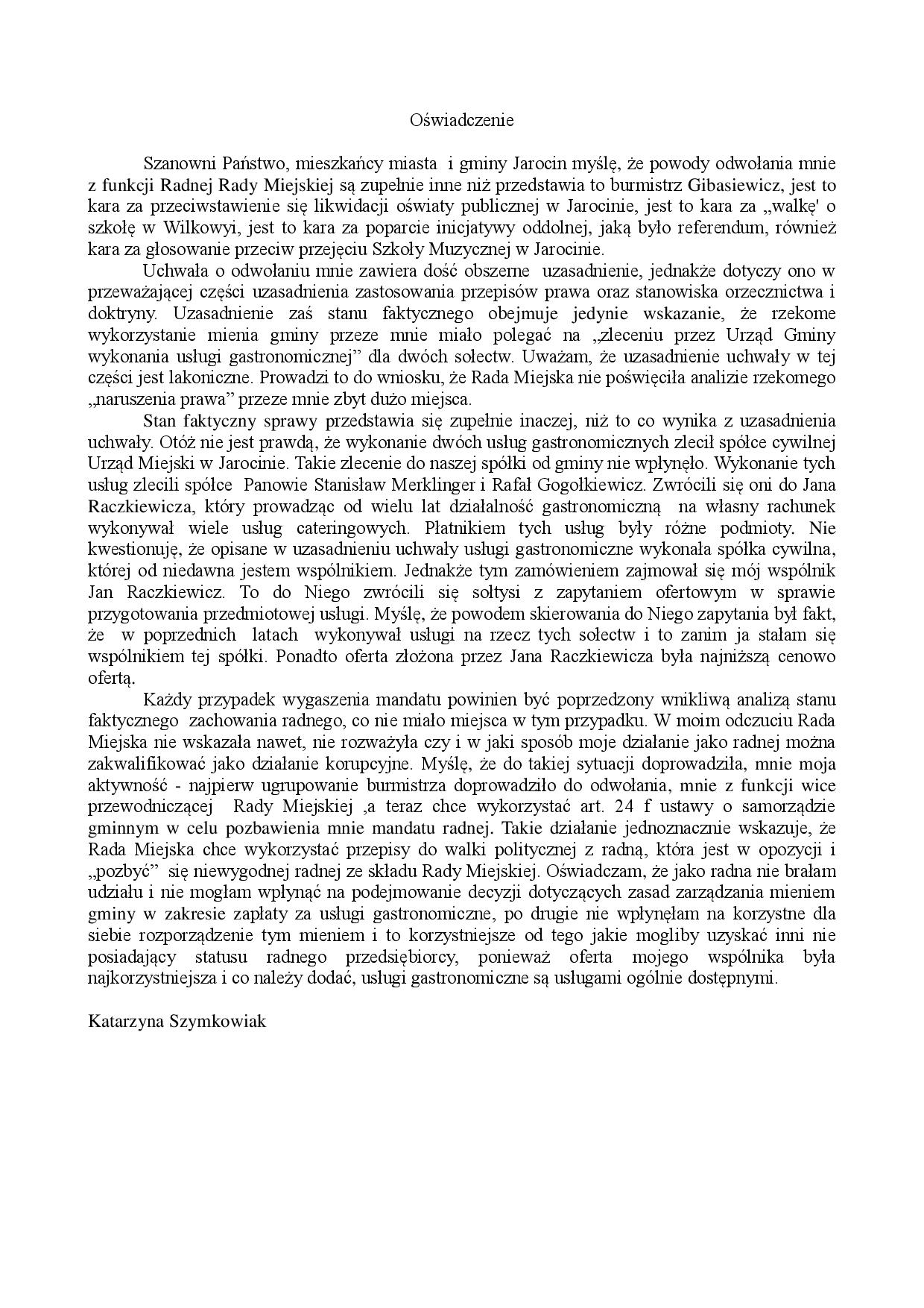 Jarocin. Oświadczenie radnej Katarzyny Szymkowiak