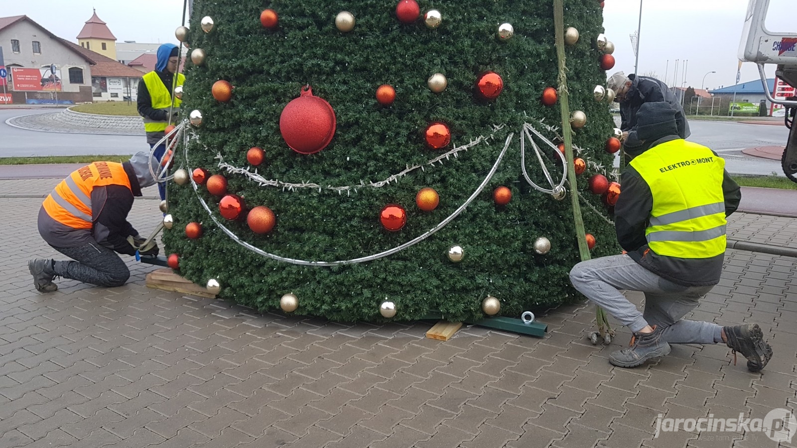 Jarocin. Ustawianie bożonarodzeniowej choinki na rondzie w Jarocinie