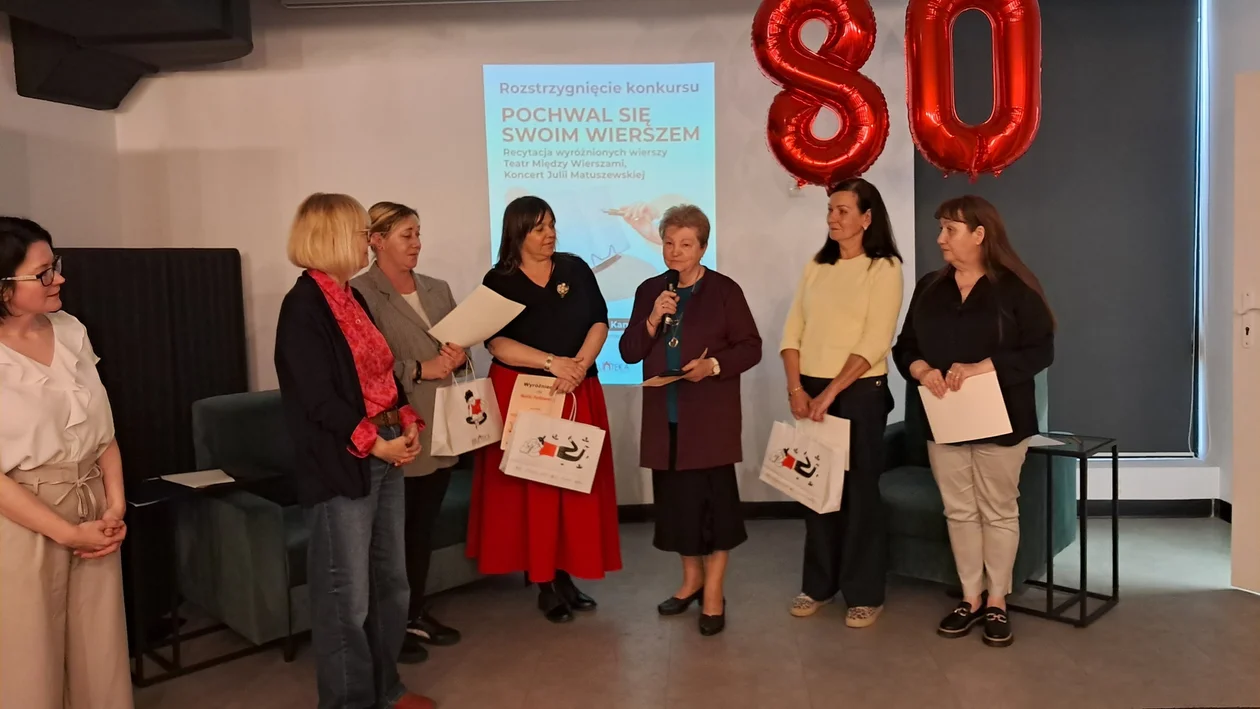 Spotkanie, na którym podsumowano konkurs poetycki i wręczono nagrody odbył się w środowe popołudnie w sali Zgody w Kamienicy Kultury. Zanim ujawniono werdykt, najpierw odbył się mini koncert Julii Matuszewskiej, która wprowadziła publiczność w nastrojowy ton. Młoda wykonawczyni zaprezentowała własne kompozycje oraz piosenkę "Nic dwa razy" znaną z repertuaru Sanah z tekstem noblistki Wisławy Szymborskiej.