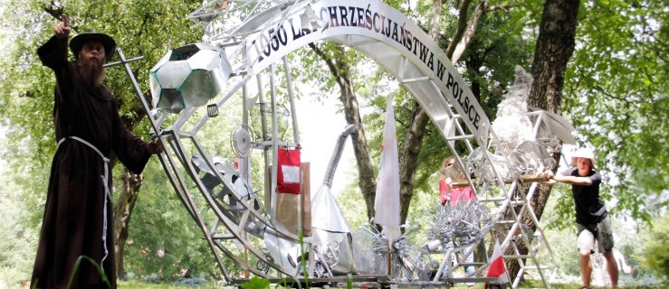 W zeszłym roku przygotowano ogromny spektakl plenerowy na temat stworzenia świata. Został on pokazany najpierw w Toruniu, a potem w Krakowie w ramach Światowych Dni Młodzieży. Pomiędzy tymi dwoma wydarzeniami ojciec Kordian Szwarc podjął pielgrzymkę z Lednicy do Krakowa, ciągnąc za sobą ogromną Rybę (na zdjęciu). W jej oku znajdują się relikwie św. brata Alberta, któremu poświęcony jest 2017 rok. Replika lednickiej bramy obecnie znajduje się w Jarocinie w ogrodzie przyklasztornym.