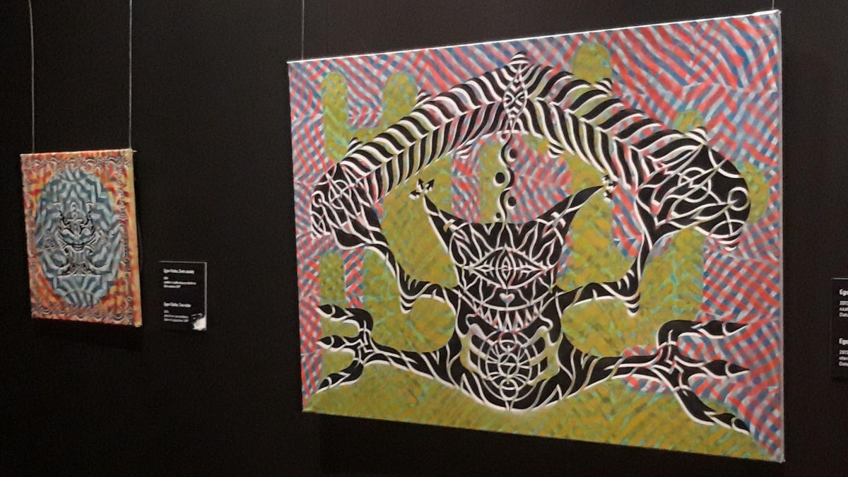 Obrazy Egona Fietke to dekoracyjne, unieruchomione w symetrycznej konwencji, zarazem wewnętrznie pulsujące i mieniące się abstrakcyjnymi i przedstawiającymi wzorami kompozycje. Przypominają swymi dywanowymi układami kolorowe makatki. Jedyna w tym zestawie monumentalna praca Czarnobyla, chociaż również oparta na osiowej strukturze, posiada zgoła odmienną wymowę. Splątane dynamicznie i uciekające w głąb linie, w centrum układają się w aluzyjne, budzące grozę kształty. Monochromatyzm oraz perspektywiczna głębia stoi w opozycji do optycznej iluzji płaszczyzny kompozycji Fietke. Zestawienie odmiennych w charakterze i wyrazie obrazów, zwraca uwagę na potencjał tkwiący w prostej zasadzie kompozycyjnej, która pozwala na wyrażenie zupełnie odmiennych wizji artystycznych.