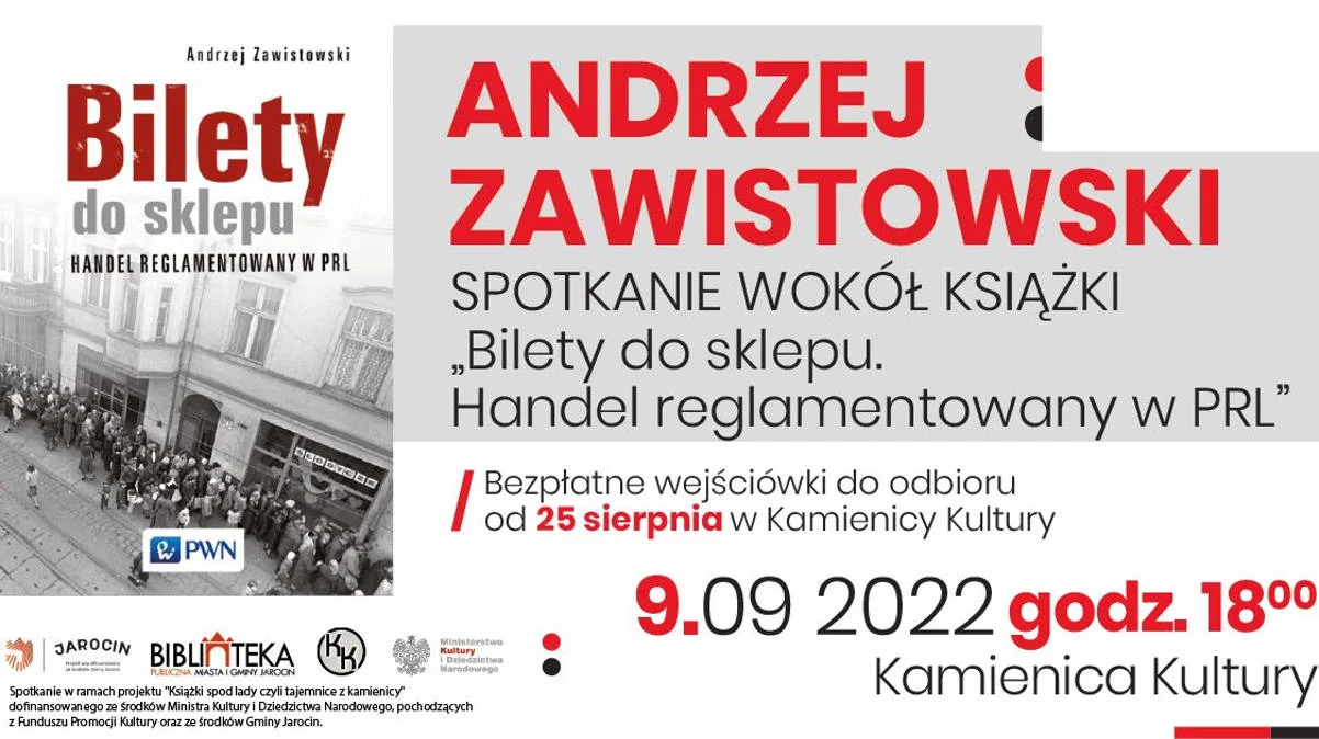 "Kto z Was pamięta kartki na cukier, ocet na półkach i pewne sklepy czynne dopiero od 13.00? Tak, tak - zapraszamy Was do świata reglamentacji! A wszystko za sprawą naszego gościa Andrzeja Zawistowskiego, wykładowcy akademickiego i autora książki "Bilety do sklepu. Handel reglamentowany w PRL" - zapraszają organizatorzy, czyli Biblioteka Publiczna Miasta i Gminy Jarocin.