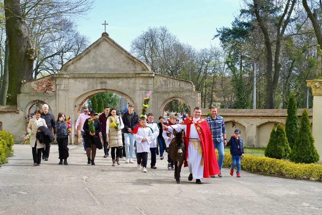 W parafii św. Stanisława Biskupa Męczennika w Żerkowie ksiądz Dominik Juszczak, który niedawno, bo nieco ponad 4 miesiące temu, rozpoczął tutaj posługę duszpasterską jako proboszcz, zorganizował wczoraj (niedziela, 13 kwietnia) poświęcenie palm przy kaplicy cmentarnej, a później wierni procesyjnie przeszli do kościoła. Nie sposób było nie zauważyć osiołka, którego prowadził kapłan.