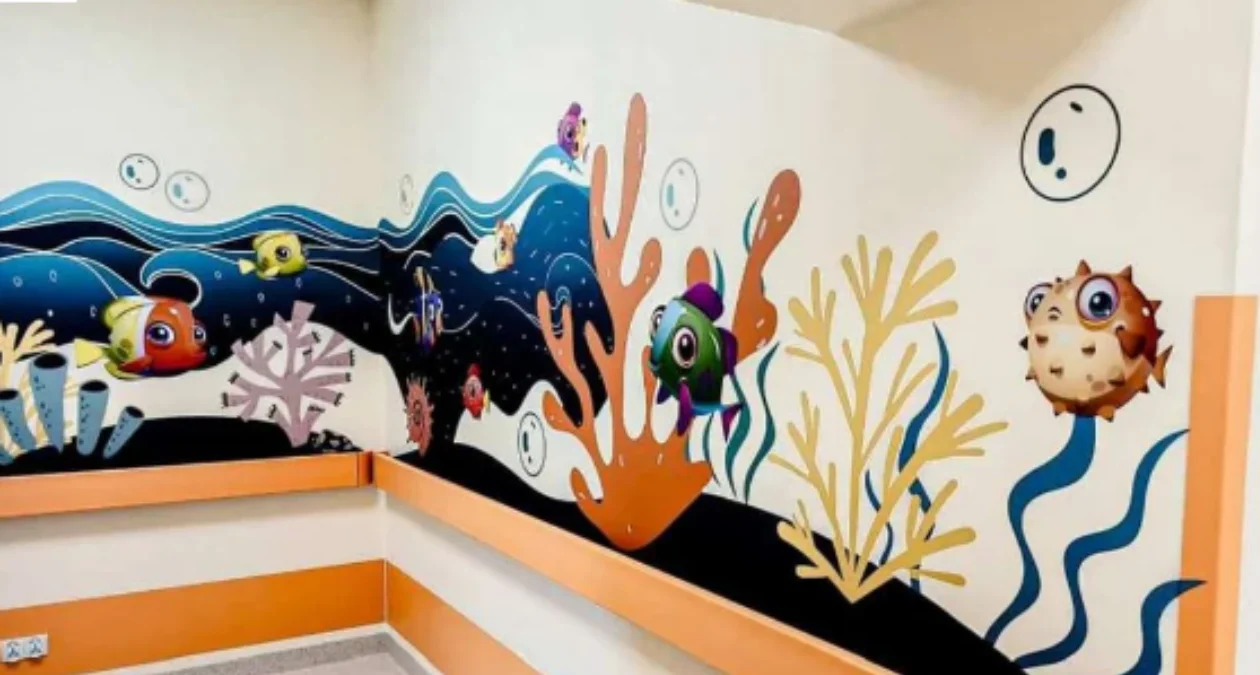 Ігрова кімната, барвисті малюнки на стінах та іграшки в новій педіатричній лікарні в Яроціні