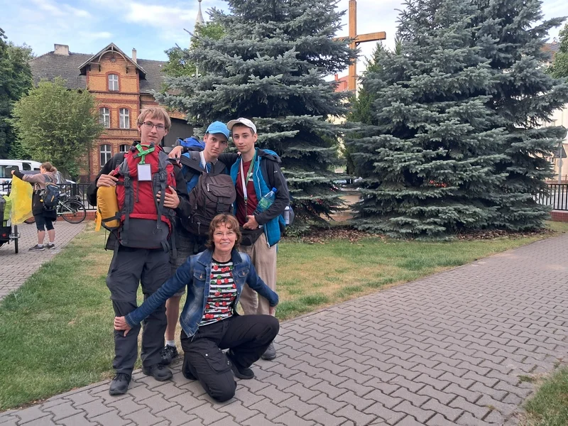 Krótko przed 20.00 doszły do nas strzępy śpiewu. - Idą! - krzyknął ktoś a ktoś inny dodał: - Biedaki! Dzisiaj przeszli znowu prawie 40 kilometrów… Śpiew wzmagał się na sile. Zza drzew zaczęła wyłaniać się nasza wyczekiwana grupa: dziewczyny, chłopaki, ktoś na wózku inwalidzkim, jakiś maluch w wózku dziecięcym. Szli w naszym kierunku, uśmiechali się, machali do nas na powitanie i śpiewali z siłą równą tej na festiwalowej scenie. Jeszcze wspólny śpiew w kościele, jeszcze sprawy organizacyjne i już mogą iść na spoczynek.