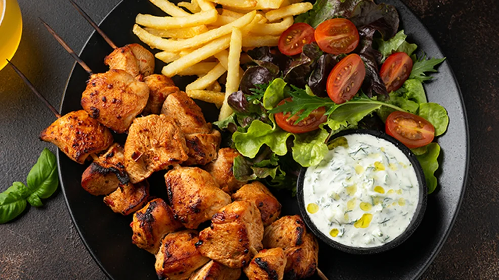 - szaszłyk drobiowy, mix sałat, sos jogurtowy, ziemniaki opiekane - 22 zł