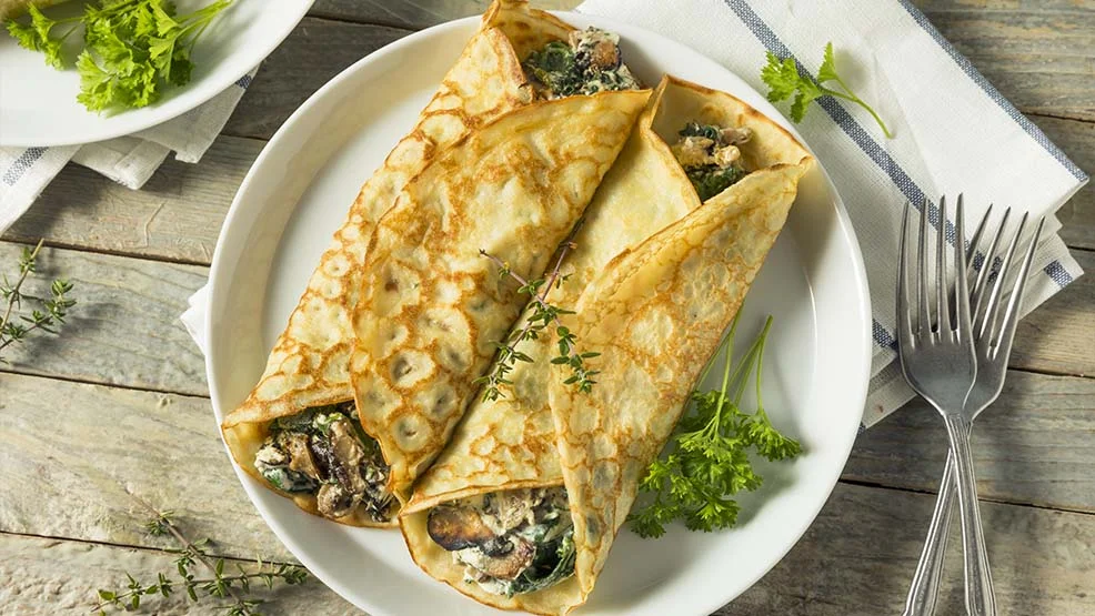 - naleśniki z gyrosem zapiekane w piecu z serem mozzarella na sałacie lodowej z pomidorkami koktajlowymi, czerwoną cebulą, papryką, ogórkiem zielonym i sosem czosnkowym