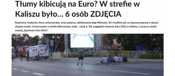 Patrząc na frekwencyjną klapę, która wydarzyła się w Kaliszu, można odnieść wrażenie, że władze Jarocina podjęły słuszną decyzję. Ponad 180 tys. zł wydały władze Kalisza na zbudowanie strefy kibica, by umożliwić kibicom oglądanie piłkarskich mistrzostw Europy "pod chmurką". Zamknięto też jedną z ulic, żeby mieszkańcy mogli bezpiecznie oglądać mecz. Tymczasem w „Sportowym kinie letnim” - jak nazwano tę strefę - pojawiło się... 6 osób.