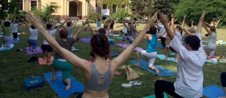 Kilkadziesiąt osób rozpoczęło dzień od jogi na polanie przed pałacem Radolińskich.