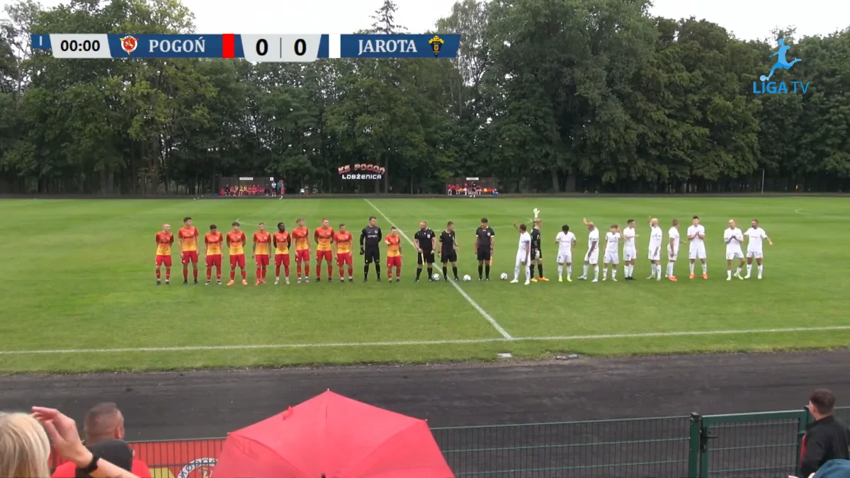 Choć Jarota w trakcie okresu przygotowawczego stosowała formację 1-3-5-2, to dziś trener Piotr Garbarek zdecydował się na ustawienie 1-4-3-3. Przez pierwszych dziesięć minut przynosiło ono efekty, bo JKS dominował na boisku, choć nie potrafił tego podkreślić bramką. Gola za to zdobyli gospodarze. Akcję z prawej strony wykończył strzałem ze skraju pola karnego Zbigniew Barańczyk. Pogoń szła za ciosem i w kolejnych minutach nasiliła swoje ataki, czego efektem było kolejne trafienie. W 23. minucie gry zza pola karnego tuż pod poprzeczkę uderzył Dawid Szcześniak. Drugie trafienie miejscowych nieco pobudziło Jarotę i dzięki temu mogliśmy oglądać pierwsze uderzenia w wykonaniu graczy trenera Garbarka. Efektem coraz częstszych ataków była bramka Miłosza Kowalskiego, który zamknął akcję Jacka Pacyńskiego. Gospodarze odzyskali jednak dwubramkowe prowadzenie jeszcze przed przerwą. Nieporozumienia po prawej stronie defensywy Jaroty wykorzystał Jan Bruski, który w sytuacji sam na sam pokonał Szymona Nowackiego.