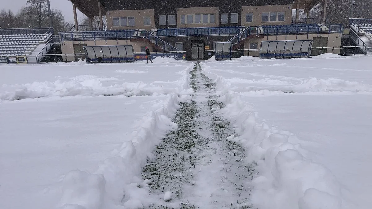 Kolejne centymetry białego puchu i ujemna temperatura sprawiły, że płyta boiska w Starogardzie Gdańskim nie nadawało się do gry.