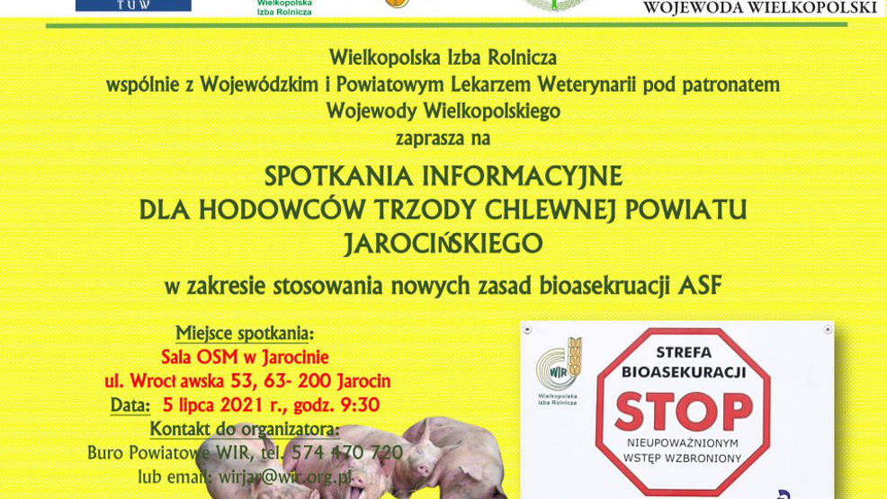 Wielkopolska Izba Rolnicza wspólnie z Wojewódzkim i Powiatowym Lekarzem Weterynarii organizuje spotkanie informacyjne dla hodowców trzody chlewnej powiatu jarocińskiego w zakresie nowych zasad bioasekuracji.