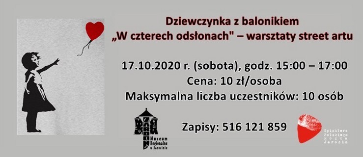 Pierwsze warsztaty poświęcone będą motywowi człowieka i maski. Podczas zajęć dzieci poznają historię street artu oraz postać brytyjskiego artysty Banks'ego. W czasie warsztatów uczestnicy wykonają maskę-wycinankę sowy oraz dowiedzą się, jak stworzyć szablon. Następnie wspólnie zrealizują mural według Banks'ego „Dziewczynki z balonikiem”. Zajęcia w Spichlerzu Polskiego Rocka w Jarocinie zaplanowano na sobotę 17 października w godz. 15.00-17.00. Maksymalna liczba uczestników to 10 osób. Koszt udziału wynosi 10 zł. Zapisy przyjmowane są pod nr. tel. 516/121-859.