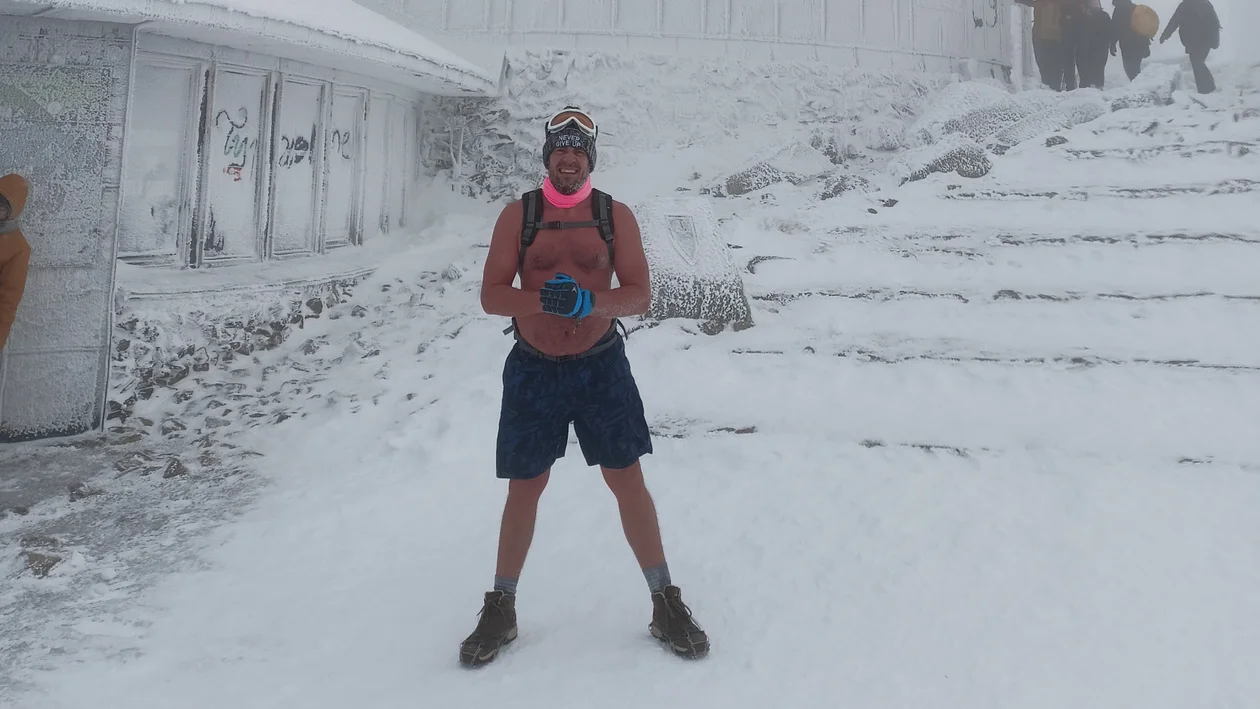 Dokładnie. Chodzenie po Jarocinie, to forma treningu przed głównym celem, jakim jest wejście na szczyt Śnieżki w samych szortach podczas siarczystej zimy, gdzie warunki zmieniają się z każdą minutą. Wchodzimy zawsze 6 stycznia - czyli w Trzech Króli, bo to taka nasza tradycja, żeby na początku roku zrobić coś mocnego i trudnego. Warunki są przeróżne: słońce, mróz, wiatr, śnieg, -20°C. To zawsze niewiadoma, a to co tajemnicze, jest zawsze pełne niespodzianek. Każde wejście jest unikalne. Najtrudniejsze warunki, które napotkaliśmy, to odczuwalne minus dwadzieścia kilka stopni i do tego wiatr - od 80 do 100 km/h. Spełnienie niesamowite. Polecam.