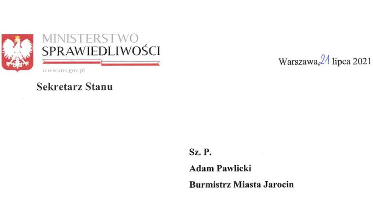 Wiceminister sprawiedliwości Michał Woś wysłał list gratulacyjny do burmistrza Jarocina Adama Pawlickiego. Pismo dotyczyło podziękowania za osobiste wyczyszczenia pomnika prof. Jana Szyszko. W liście datowanym na 21 lipca 2021 roku, czytamy