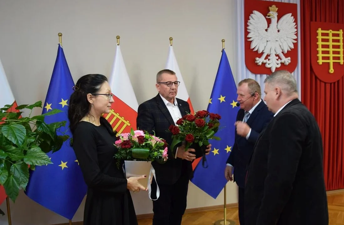 Przewodniczący jaraczewskiej rady - Roman Matuszak i wiceprzewodniczący - Tadeusz Pera, wręczyli kwiaty nie tylko burmistrzowi, ale także skarbnik gminy - Patrycji Wieruszewskiej-Dziergaczow.