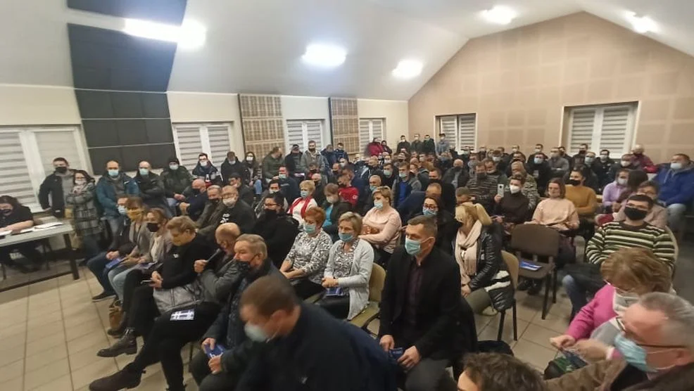 Sala w Siedleminie jest zapełniona uczestnikami zebrania. Oprócz mieszkańców w zebraniu uczestniczą przedstawiciele Urzędu Miejskiego w Jarocinie z wiceburmistrzem Bartoszem Walczakiem.