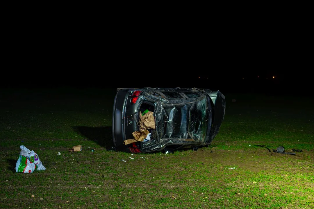 Tam z drogi wypadła kierująca citroenem. Auto dachowało i zatrzymało się na polu. Kierująca może mówić o dużym szczęściu. Pojazd jest bardzo mocno rozbity.