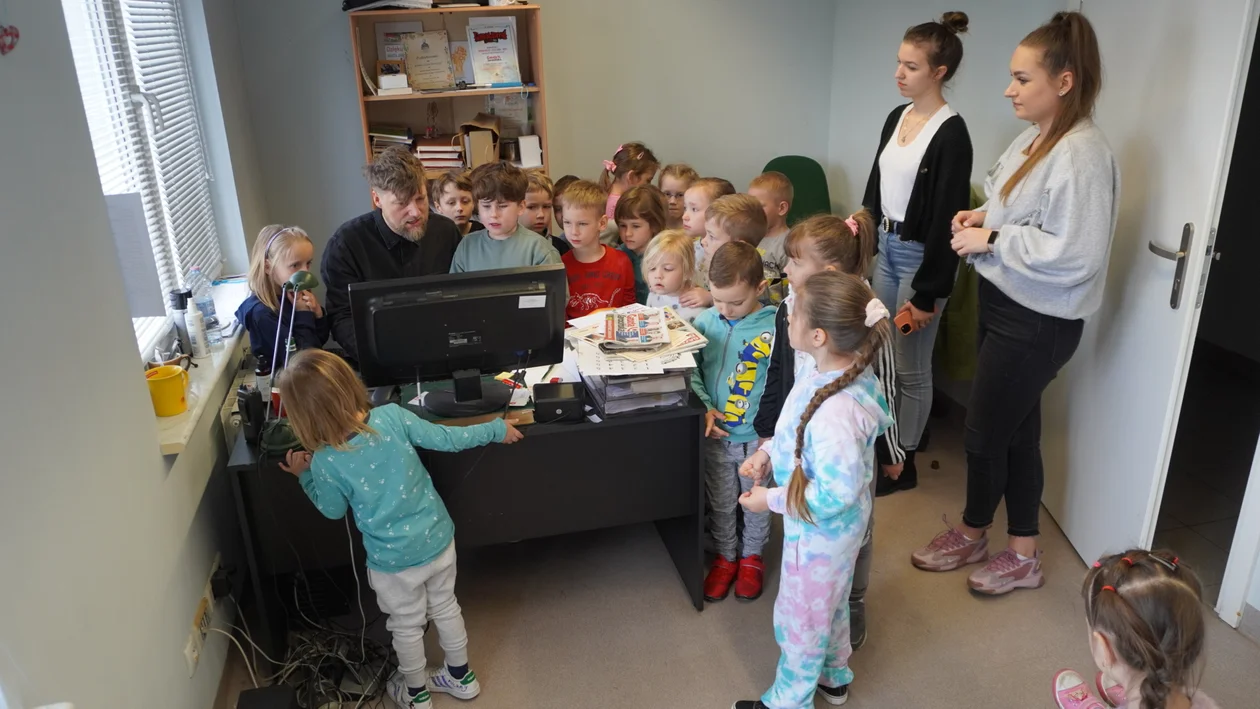 Maluchy oprowadzał redaktor naczelny Bartosz Nawrocki. Przedszkolaki dowiedziały się, jak wygląda każdy kolejny etap powstawania artykułów i czym zajmują się poszczególne działy w redakcji.