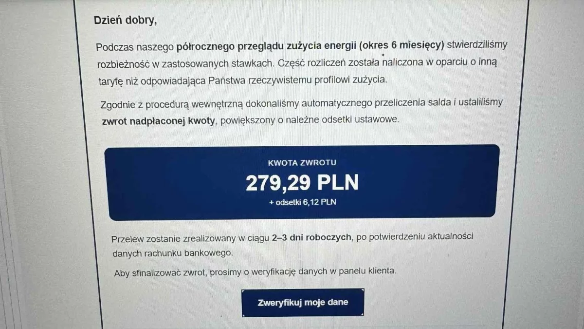 „Podczas naszego półrocznego przeglądu zużycia energii (za okres 6 miesięcy) stwierdziliśmy rozbieżność w zastosowanych stawkach. Część rozliczeń została naliczona w oparciu o inną taryfę niż odpowiadająca Państwa rzeczywistemu profilowi zużycia. Zgodnie z procedurą wewnętrzną dokonaliśmy automatycznego przeliczenia salda i ustaliliśmy zwrot nadpłaconej kwoty, powiększony o należne odsetki ustawowe. Kwota zwrotu 279,29 zł + odsetki 6,12 PLNPrzelew zostanie zrealizowany w ciągu 2-3 dni roboczych po potwierdzeniu aktualności danych rachunku bankowego. Aby sfinalizować zwrot, prosimy o weryfikację danych w panelu klienta”.
