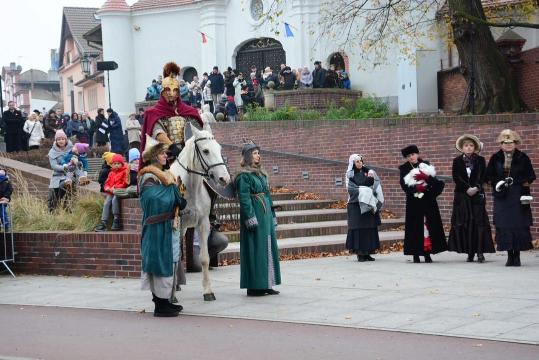 Już w czasie sumy odpustowej nie sposób było nie zauważyć kilku osób w kostiumach. Marek Sobczak - dyrektor Wydziału Oświaty i Kultury Urzędu Miejskiego wraz z regionalistą Wojciechem Koterbą w kościele prezentowali się w rzymskich zbrojach. Tuż obok nich w pierwszej ławce zasiadła burmistrzyni Jarocina - Urszula Wyremblewska-Korzyniewska - w pięknej fioletowo-różowej kreacji, uzupełnionej stylowym kapeluszem. W ręce trzymała symboliczny klucz do miasta, który później - na rozpoczęcie inscenizacji legendy o św. Marcinie - przekazała głównemu bohaterowi. Do tej pory włodarze zwykle przemawiali na rozpoczęcie przedstawienia, przygotowywanego przez Stowarzyszenie Bellator Societas z Poznania wraz z Biblioteką Publiczną Miasta i Gminy Jarocin, ale nie zdecydowali się stać częścią plenerowego widowiska, które w tym roku zorganizowano w poniedziałek (11 listopada) już po raz czwarty.