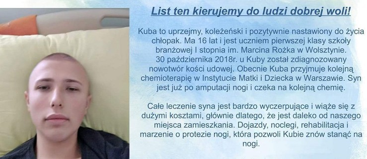 Jakub Ochnio ma 16 lat. Mieszka w Żółkowie. Pod koniec października zdiagnozowano u niego nowotwór kości udowej. Od tego czasu przeszedł kilka chemioterapii w Instytucie Matki i Dziecka w Warszawie. Niestety choroba nie odpuściła i dlatego lekarze musieli amputować mu nogę. Leczenie i rehabilitacja wiążą się z dużymi kosztami, które przekraczają możliwości finansowe rodziny Kuby.