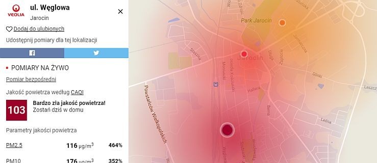 Jarocin. Widzicie te czerwone punkty? Bardzo złe powietrze!