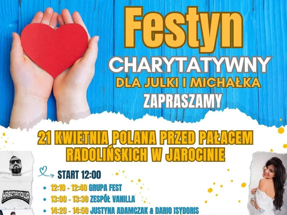 Aby pomóc Julce i Michałkowi w kolejną niedzielę (21 kwietnia) na polanie przy pałacu Radolińskich zostanie zorganizowany festyn charytatywny. Patronat nad przedsięwzięciem organizowanym przez stowarzyszenie Skrzydlaci Bohaterowie objęła "Gazeta Jarocińska". Impreza rozpocznie się w południe.