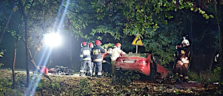 Jadący mercedesem uderzył w drzewo, a potem w znak drogowy. Kierowca był zakleszczony w aucie. Aby go uwolnić strażacy musieli użyć sprzętu hydraulicznego.