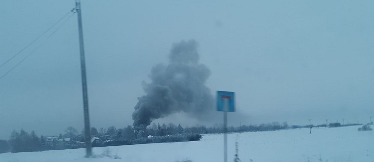 Kłęby dymu widać z dużej odległości. Garaż przylega do budynku mieszkalnego.