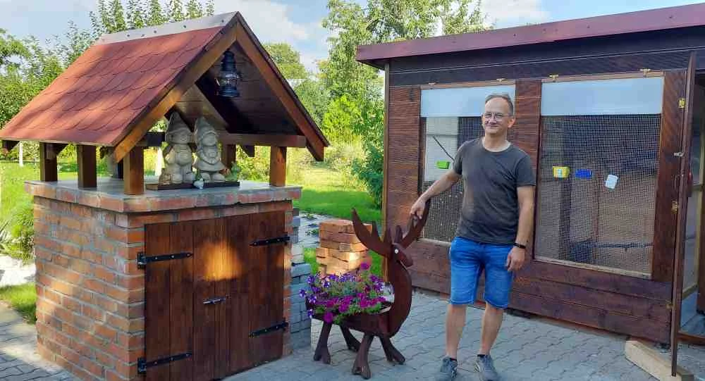 - Do dziś pamiętam jak otworzyliśmy te klatki, a w nich znalazłem dwadzieścia kurzych jaj. Ciekawostką było to, że ani jedno nie było popsute - opowiada z uśmiechem na ustach Dariusz. - Sam zakup działki był dla nas kosztowny, dlatego w pierwszym roku zależało nam, aby rozbudować altanę i taras. Poprosiłem stolarza, aby przyjechał na działkę i pomógł w budowie. To był czas pandemii na szczęście nie miał zbyt dużo zamówień. Damian był tak zafascynowany ogrodem, że sam postanowił zakupić tutaj działkę i do dziś ją uprawia. Pod Kobylinem znalazłem fajny tartak. Mieli tam tanie drewno. Wykorzystując czas, że był już na działce stolarz, wymyśliłem kolejne prace jakie mógłby wykonać. I tak rozpoczynając od rozbudowy altany, wykonał jeszcze kilka innej architektury. Jeszcze tego samego, roku kilka tygodni przez zimą, zakładałem płytki chodnikowe na ścieżce, która prowadzi od początku do końca działki. Dobrze, że wtedy zarówno jesień jak i zima były ciepłe i mogłem popracować. Nigdy nie zapomnę jak zakładałem krawężniki. Zmarnowałem na nie cały tydzień. Chciałem wykorzystać te co były, tylko jakoś je wyrównać, założyć, uporządkować na nowo. Malowałem wapnem, kombinowałem, ale efekt był marny. Po siedmiu dniach dałem już spokój. Zaprosiłem fachowca kolegę, który ma firmę budowlaną. Zaproponował, że wykona tą pracę. Zaufałem mu, kupiłem kostkę, dogadaliśmy się i zrobił. Pierwszy rok był dla nas bardzo pracowity. Priorytetem była altana, ale poczułem takiego ogrodowego bakcyla, że skończyłem na ścieżkach, obrzeżach, tarasie i całej altanie wraz z dobudówką do narzędzi.