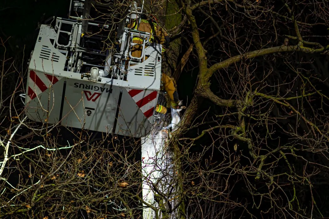 Kot siedział na drzewie w Witaszycach. Musieli przyjechać strażacy z podnośnikiem