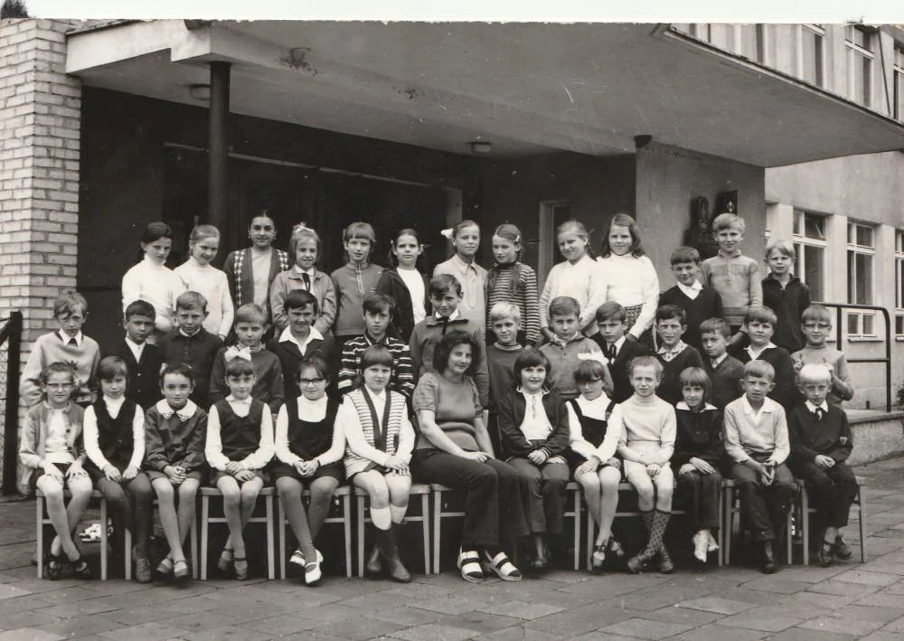 Zdjęcie klasy IV a: Krzysztof stoi jako pierwszy po lewej stronie w drugim rzędzie/ja na górze po środku z białą kokardą.