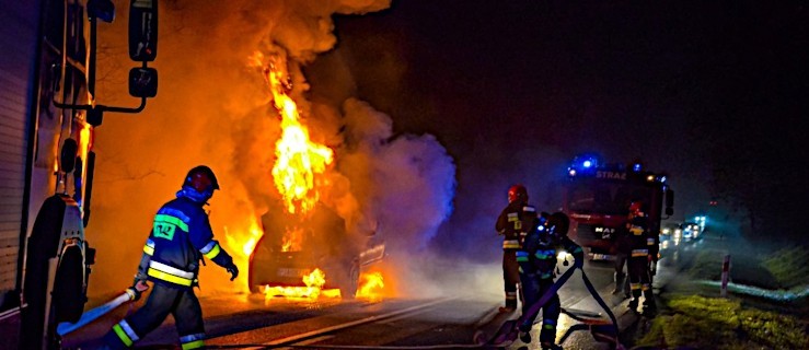 Auto stanęło w ogniu w czasie jazdy. Kiedy strażacy zajechali na miejsce zdarzenia całe było objęte płomieniami.