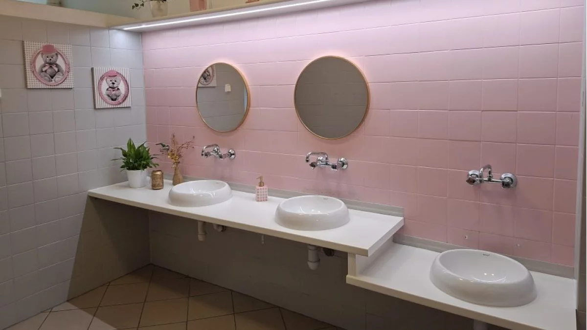 Łazienki dla dziewczynek zostały pomalowane w delikatne różowo-szare barwy, a całość uzupełniają złote dodatki, nowoczesne białe blaty oraz nowe umywalki. Przestrzeń zdobią piękne ozdoby i zielone kwiatki, które nadają wnętrzu przytulny i elegancki charakter. Z kolei łazienki chłopców zyskały świeże miętowo-szare ściany z czarnymi dodatkami, nowymi blatami i umywalkami. Zawisły tam również lustra w czarnych oprawach oraz kwiaty, które ożywiają przestrzeń i dodają jej stylu. Wszystkie prace zostały wykonane ze środków pozabudżetowych.