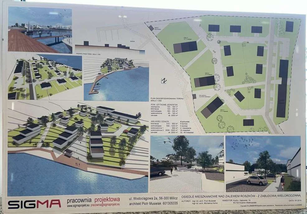 Przedstawił też radnym plany, które ma obecnie wobec gruntów w Siedleminie. Teren w części (ok. 50 - 60 ha), miałby zostać podzielony na działki budowlane, a w części przeznaczony pod fermę fotowoltaiczną. Przedsiębiorca na dowód tego, że warto inwestować w budownictwo mieszkaniowe w tej okolicy, zaprezentował radnym, jak może wyglądać zagospodarowanie należącej do niego nieruchomości, która położona jest w okolicy zalewu roszkowskiego - zobacz wizualizację PONIŻEJ. Przedsiębiorca pokazywał radnym plansze z projektami z 2014 i 2022 roku.