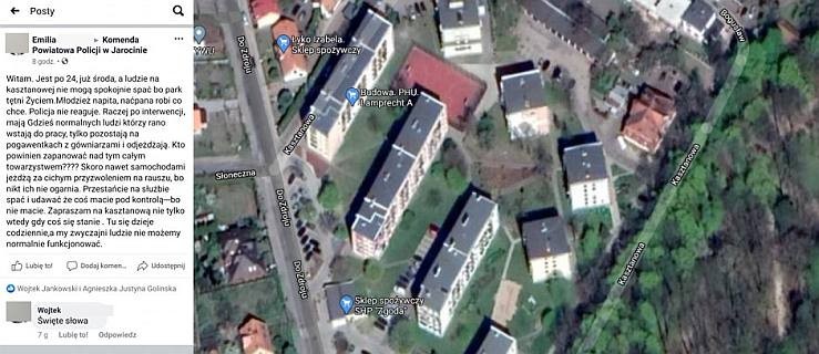 „Jest po 24.00, a ludzie na kasztanowej nie mogą spokojnie spać, bo park tętni Życiem. Młodzież napita, naćpana robi co chce. Policja nie reaguje. Raczej po interwencji, mają Gdzieś normalnych ludzi którzy rano wstają do pracy, tylko pozostają na pogawentkach z gówniarzami i odjeżdżają” - twierdzi autorka wpisu.