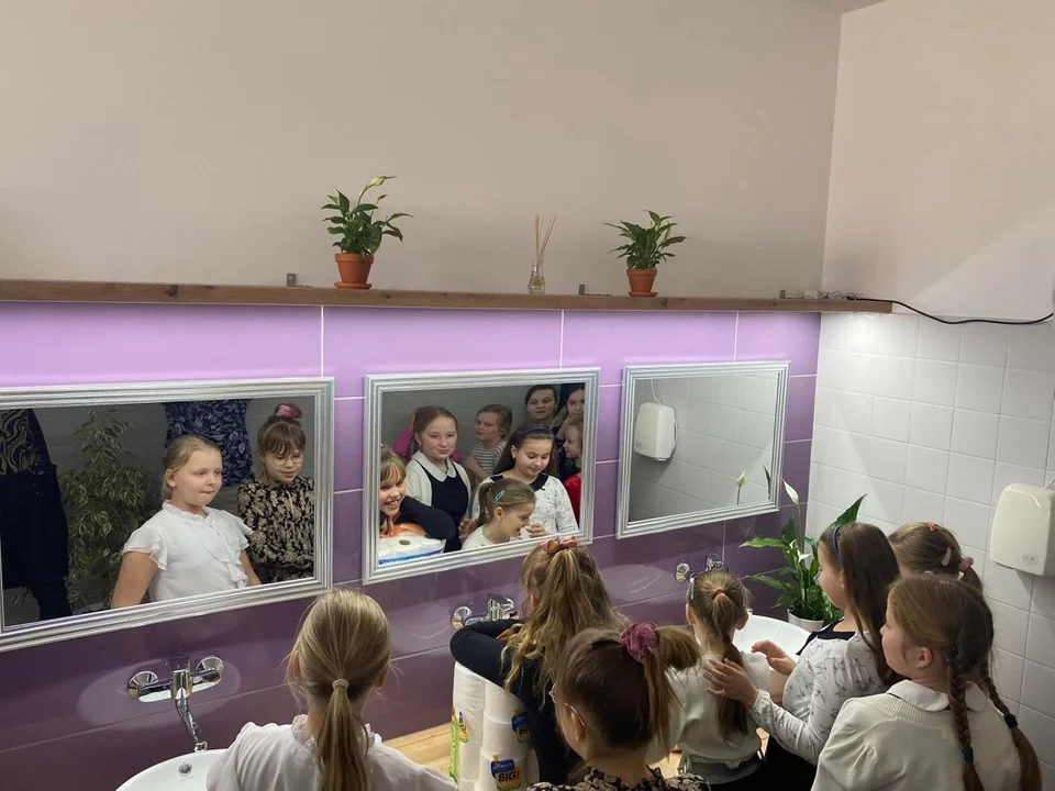 Łazienka jest estetyczna i pięknie odnowiona. Wszystkie środki na remont zostały zakupione z pieniędzy wypracowanych przez samorząd uczniowski, zbiórka trwała dwa lata. Dwóch rodziców oraz woźny pomogli wykonać niektóre prace remontowe. W łazienkach wymieniono umywalki, krany, ubikacje oraz lustra.