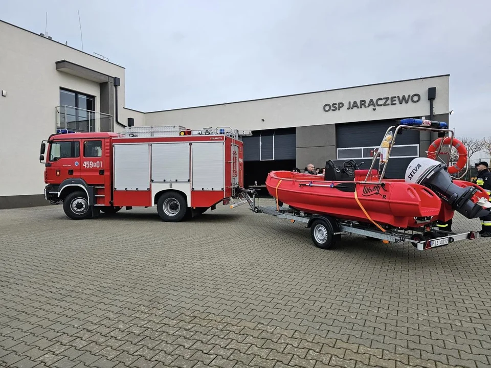 Świąteczny prezent otrzymali także strażacy z OSP Jaraczewo. Druhowie odebrali nową łódź ratownicza z silnikiem zaburtowym, przyczepą podłodziową oraz dodatkowym wyposażeniem. W przywiataniu łodzi wzięli udział Dariusz Strugała, burmistrz Jaraczewa i Olga Kaczmarek, zastępca burmistrza.