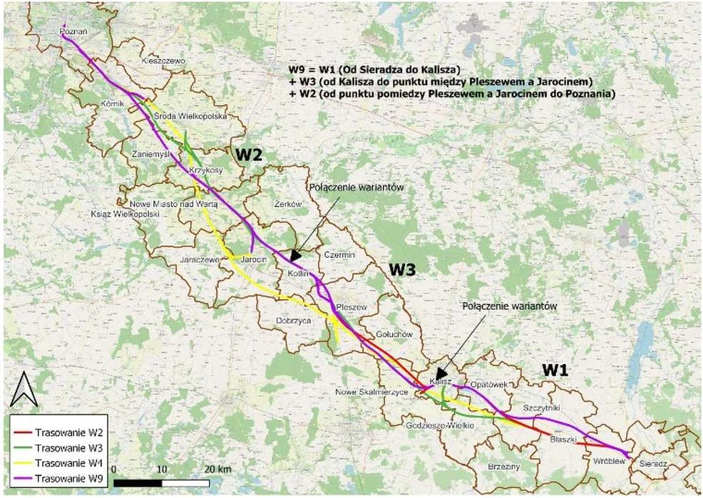 Wybrany został wariant piąty - tak zwany hybrydowy oznaczony symbolem W9 - zobacz MAPĘ TUTAJ. Trasa jest kompilacją przebiegu wariantu W1 do rejonu Kalisza, W3 od Kalisza do Kotlina i W2 od Kotlina do Poznania.