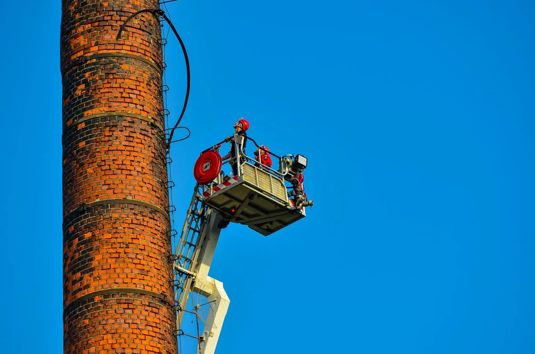 Element zawisł na wysokości około 60 metrów. Teren został zabezpieczony, a dalsze działania podejmie właściciel obiektu.