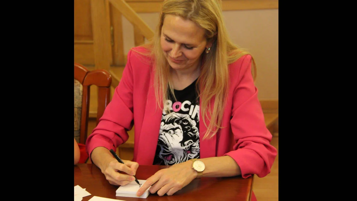 Niespodziewanie półkoloniści spotkali w starostwie burmistrza Jarocina Urszulę Wyremblewską-Korzyniewską, która - na ich zaproszenie, dołączyła do spotkania i razem ze starostą rozdawała autografy, co wywołało mnóstwo radości i uśmiechów.