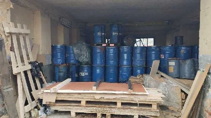 W nieczynnym magazynie na terenie byłej firmy zajmującej się recyklingiem przepracowanego oleju znajduje się około 240 beczek o pojemności 200 litrów.