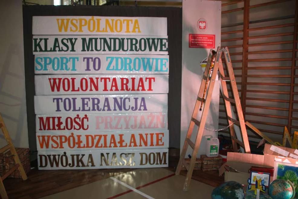 Młodzi artyści symbolicznie przedstawili też wartości, jakimi kieruje się placówka. Pokaźnej wielkości bloczki z napisami: „Dwójka nasz dom”, „Współdziałanie”, „Miłość i przyjaźń”, „Tolerancja”, „Wspólnota”, „Wolontariat”, stanowiły elementy, że których zbudowana jest szkoła.
