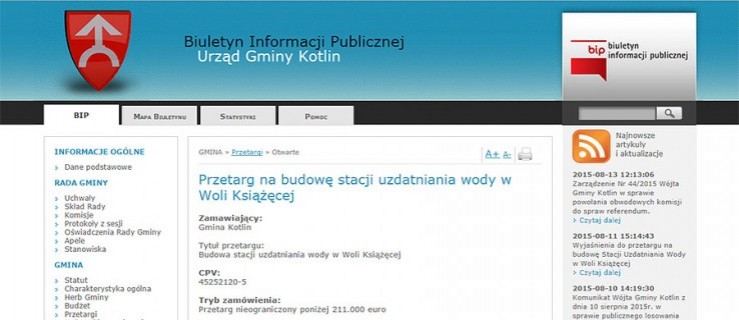 Wójt gminy Kotlin ogłosił przetarg na budowę stacji uzdatniania wody w Woli Książęcej. Planowane jest wybudowanie budynku, dwóch zbiorników wyrównawczych wody, odstojnika, zbiornika bezodpływowego na ścieki, dwóch studni oraz instalacji związanych z funkcjonowaniem stacji. Oferenci mogą się zgłaszać do jutra do godziny 10.00. Inwestycja ma być zrealizowana do 20 listopada.