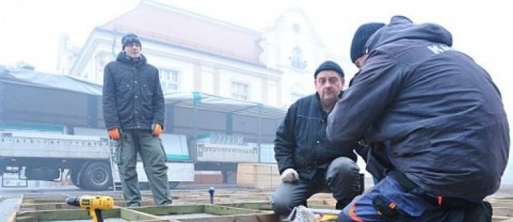 Od świtu gdyńska firma Ksjus montuje lodowisko na rynku w Jarocinie.