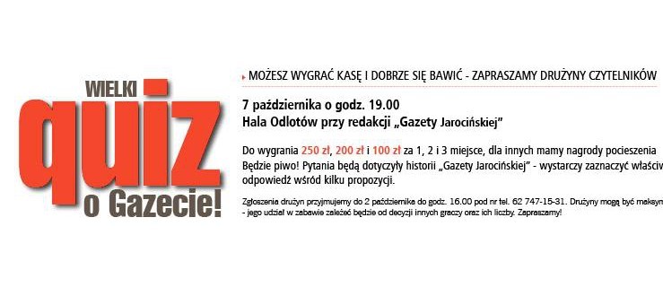 Jeśli chcecie dobrze się bawić, a przy okazji wygrać pieniądze, ten konkurs jest dla Was! 7 października o godz. 19.00 w "Hali Odlotów" w siedzibie "Gazety Jarocińskiej" odbędzie się "Wielki quiz o Gazecie". Wy także możecie wziąć w nim udział i wykazać się swoją wiedzą. Jak to zrobić?