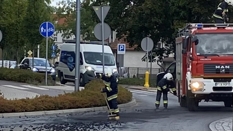 Teraz dostali wezwanie na rondo Powstania Wielkopolskiego. Tam znajduje się rozsypany węgiel. Ratownicy z OSP Jarocin usuwają opał z jezdni. Węgiel leży także na ulicy Wojska Polskiego w kierunku Bolesława Chrobrego.