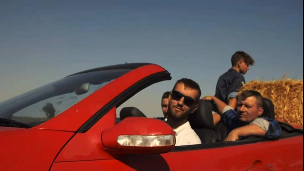Na pole wybrali się nie tylko ze sprzętem rolniczym, ale i kamerą. Nagrali ponaddwuminutowy film. Kamerą zarejestrowali prasowanie słomy i zwożenie snopków. Możemy też zobaczyć, jak młody rolnik porusza się w rytm tanecznej muzyki podczas układania snopków. W trakcie zbierania słomy rozmawiają o dożynkach, o tym, czy są pieniądze na ich organizację. Nagle na pole wjeżdża czerwony mercedes kabriolet.